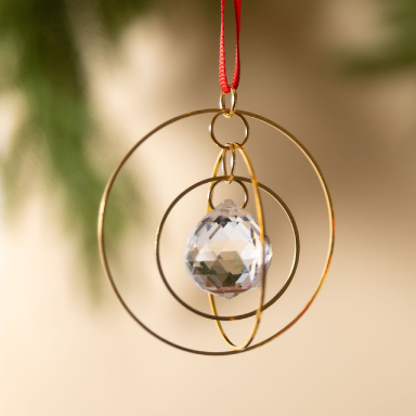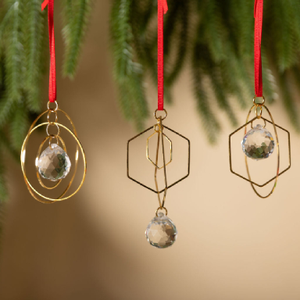 Made of jewelry-quality, gold-plated brass and crystal prisms, each ornament features a prism nested within 3 large, shiny circles. This 3-dimensional design will twirl and sparkle when the light hits it! They are accented with an approx. 2.5 inch long red, Grosgrain ribbon.